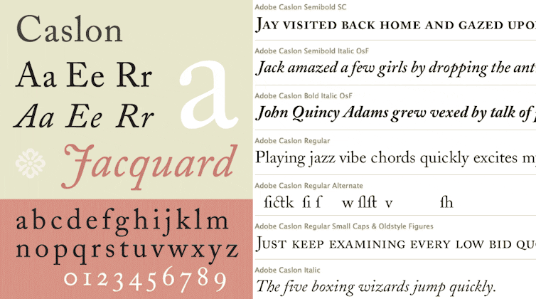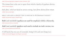 Choose a typeface with a family – roman (sometimes called regular), bold, italic, at the minimum. This allows you to add emphasis to words or italicise titles without having to change typefaces.