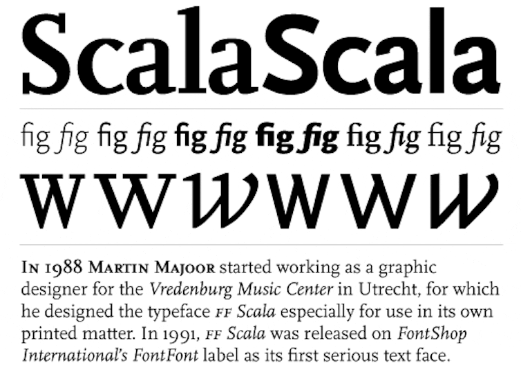 If you’re using multiple typefaces (remembering the Bauhaus adage: less is more), make sure they sit well together. Either choose a face such as Scala (above) with a sans serif and a serif, or choose two faces that are compatible. Test this by looking at two things – x-height and the shape of bowls: