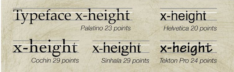 Point size is a unit of measure for the size of a typeface. Novels are usually set in around 12pt type. However, as US designer Ellen Lupton demonstrates below, different typefaces can be set in the same point size but look very different: