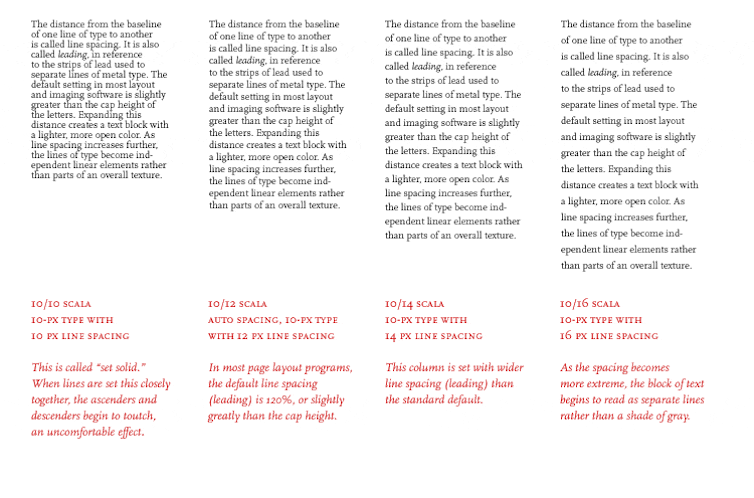 Leading, or line spacing, is the amount of space between lines of text. The relationship between the point size and the leading is ultimately what will make the text readable (or not). Too little leading makes the text dense and difficult to read, too much makes it difficult for your eye to find its way to the next line.